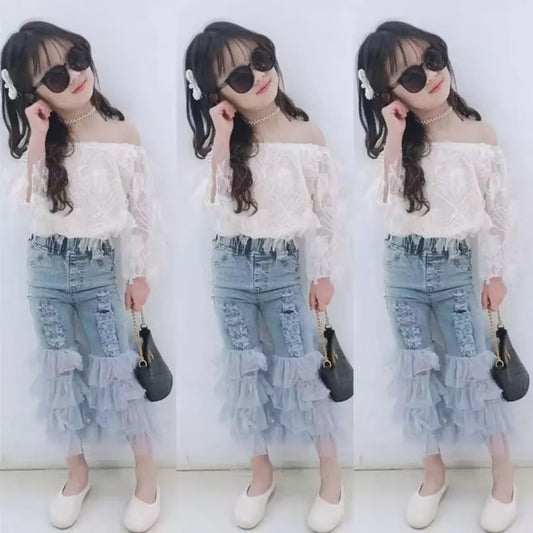 • 1-5Y Kids Clothing Spring and Summer 60%Cotton One-shoulder Tops + Jeans Flared Pants Girls Clothes Sets