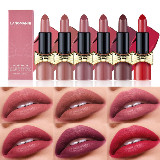 • Bowknot Lipstick Matte Velvet Nude Lipstick Brightly Coloured Lip Tint Balm Non-stick Cup Smooth Sexy Red Pink Lip Glaze Makeup