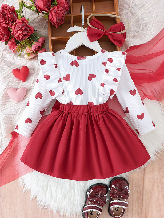 2PCS Autumn New Style For 0-2-Year-Old Girls, Comfortable Sweet And Fashionable Red Love Bow Top + Short Skirt Set