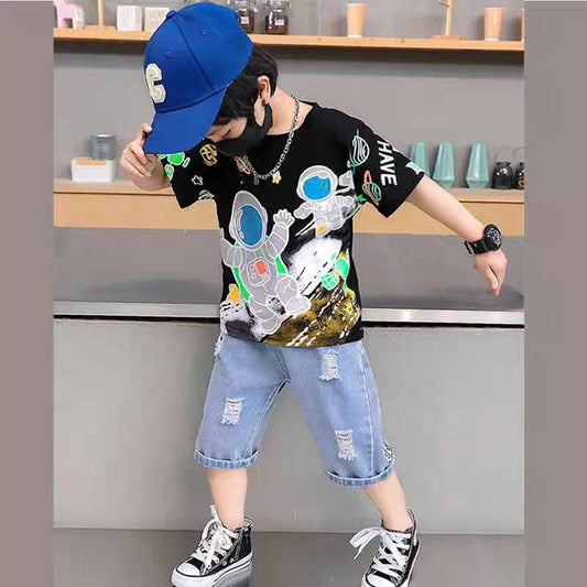 • Children's Summer Clothes Short-Sleeved Jeans Two-Piece Trendy Set