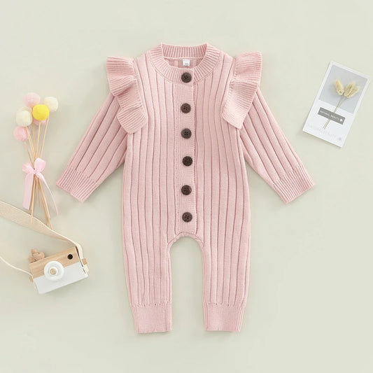 • New  Winter Baby Girl’s Knitted Long Sleeve Sweater Jumpsuit Fashion Solid Color Round Neck Ruffles Button Warm Romper Outfits
