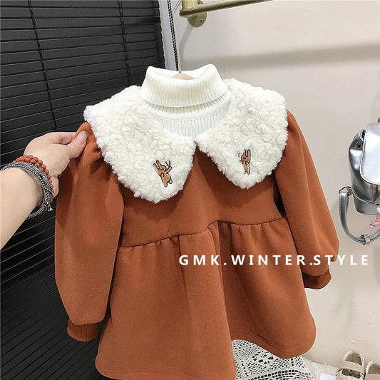 Winter Little Girl Dress Cotton Plus Velvet Thick Infant Baby Girl Vestido Loose Animal Turn Down Collar Kid Girl Princess Dress