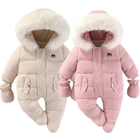 • Winter Newborn Baby Girl Clothes Thicken Baby Romper With Gloves Warm Baby Jumpsuit Hooded Plus Velvet Children Snow Wear 0-18M