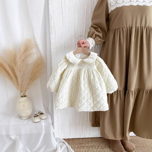 Baby winter dress girl plus velvet padded skirt children's sweet and lovely doll lapel clip cotton.