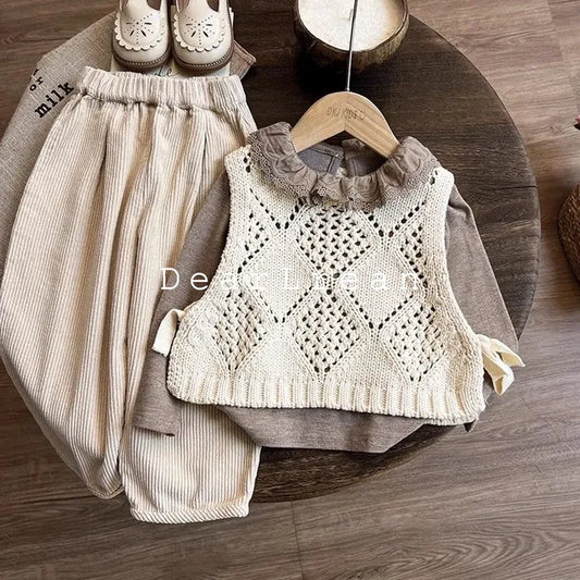 Girls autumn cut-out knitted vest pants three-piece set of cute ins korean jacket sweater for kids