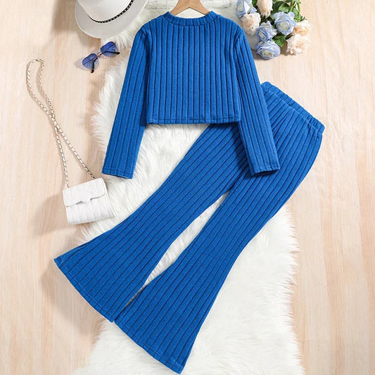 • Spring Autumn Girls Clothing Set Solid Color Pit Strip Long Sleeve Sweatshirt+Wide Leg Pants 2Pcs For 8-12Y Teenagers Girls Suit