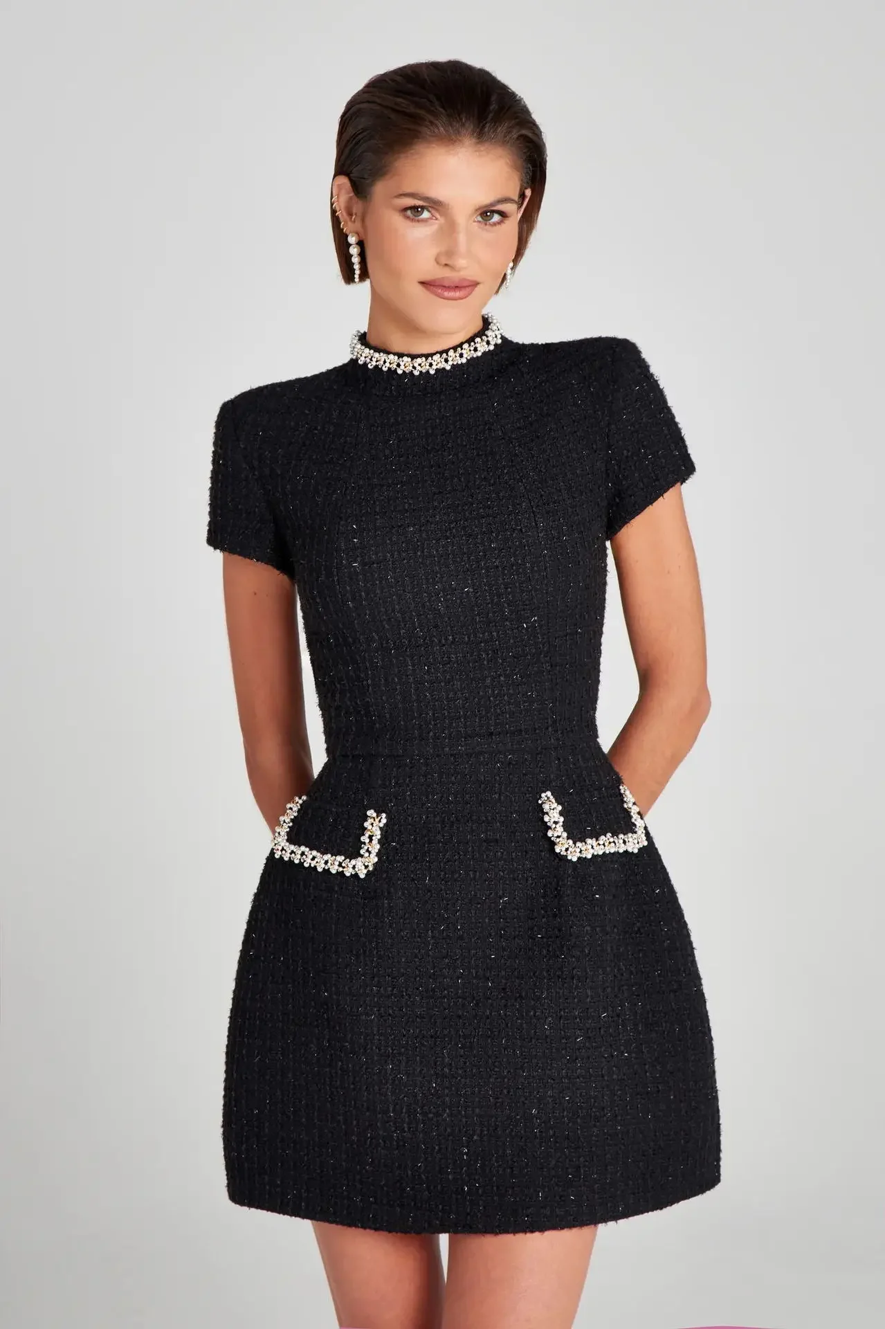 • Elegant Female Patchwork Party Dress Sexy Women Evening Dress Autumn Lady Suit Collar Short Sleeve Slim Dress