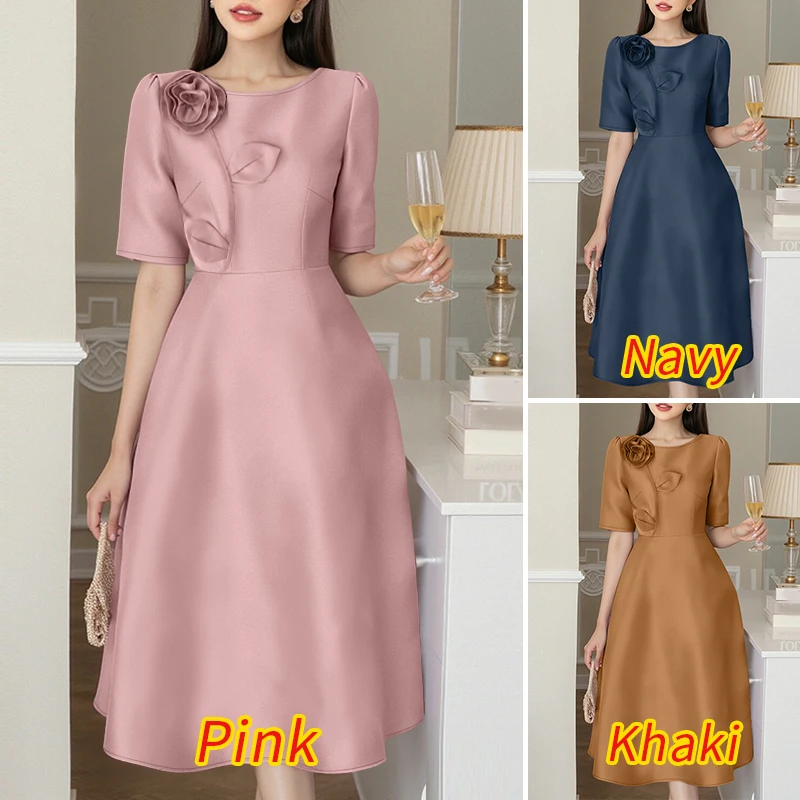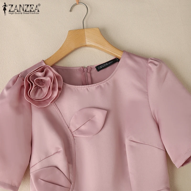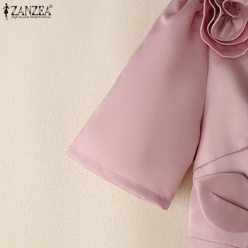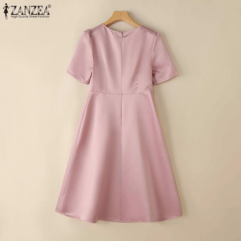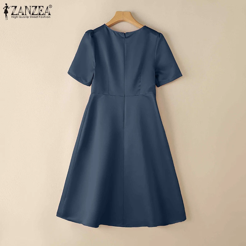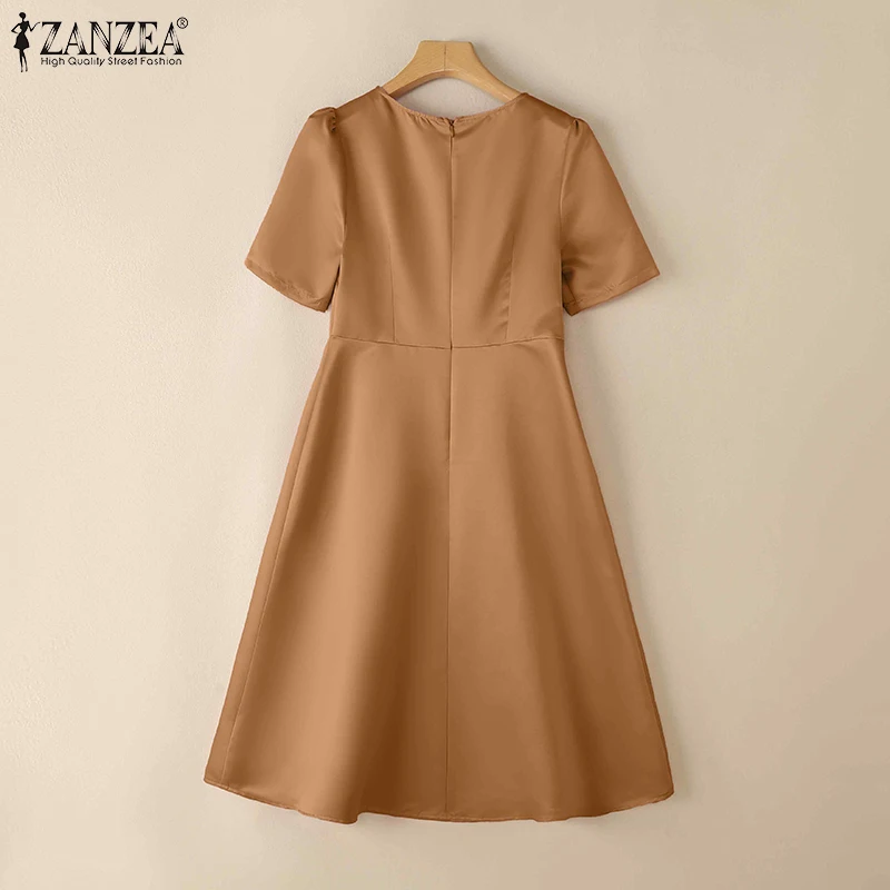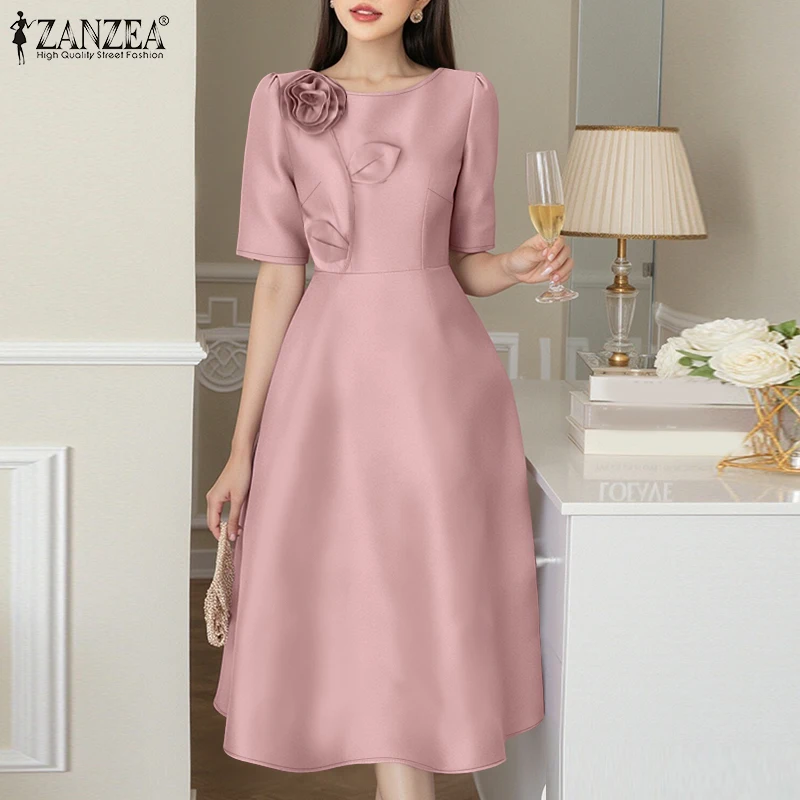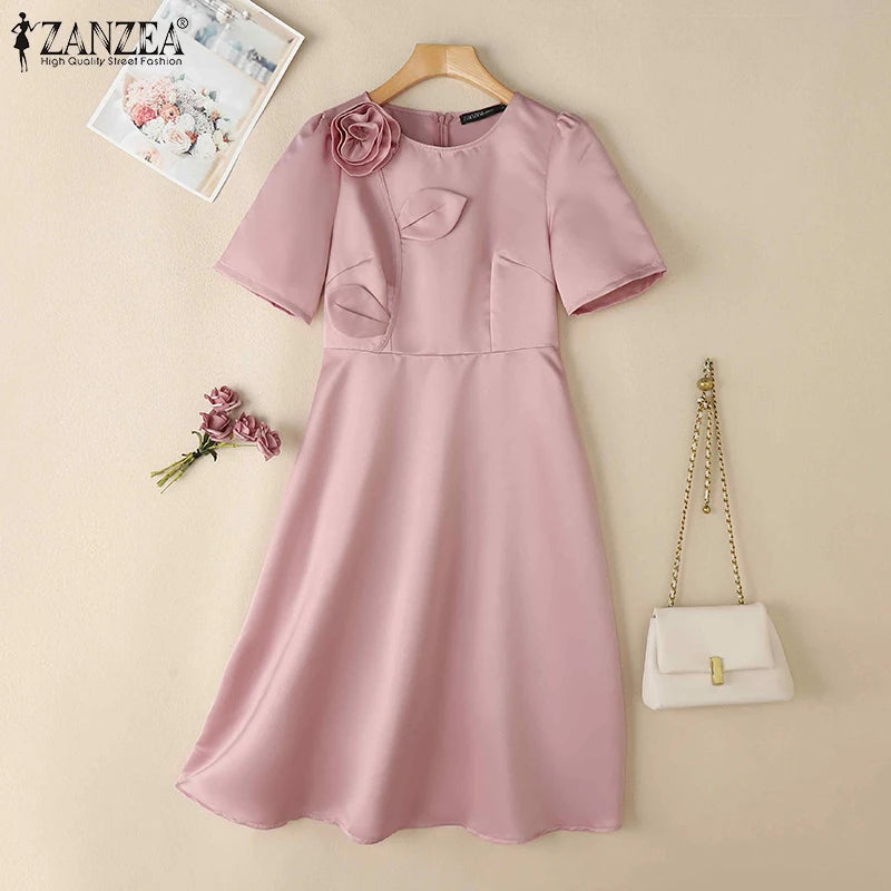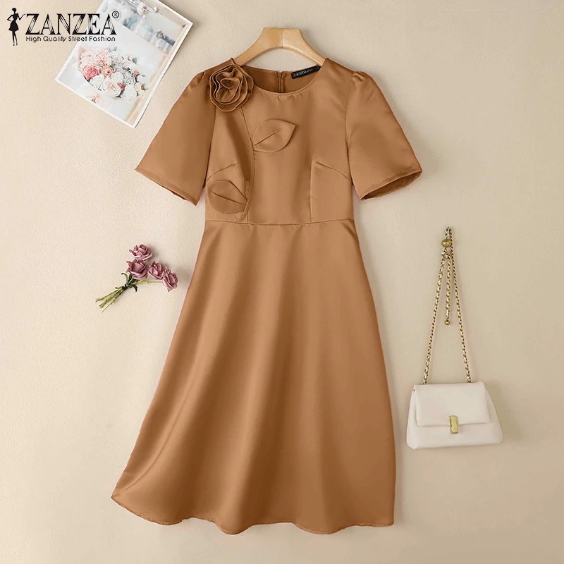 ZANZEA Elegant Woman Party Dresses Shiny Satin Round Neck Short Sleeve Fabric Flower A-line Robes Femme Fashion Midi Vestidos